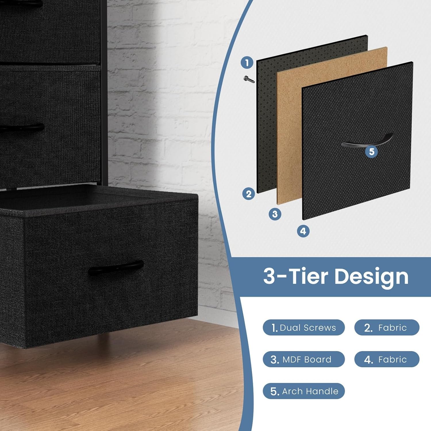 This tool is designed using premium MDF board and reinforced with a metal frame, supporting up to 66 lbs per drawer. Each drawer slides smoothly on metal rails, and the black finish complements most modern dresser or living room furniture setups.