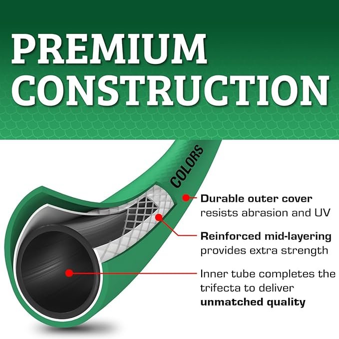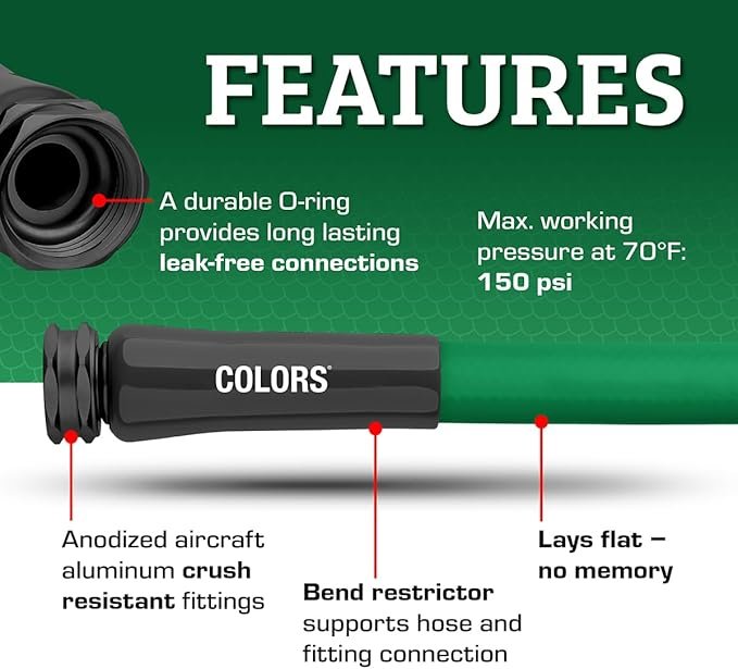 The aircraft-grade, crush-resistant anodized aluminum fittings ensure a firm, leak-free seal even when used on a daily basis. The abrasion-resistant cover prevents the interior from wear and tear due to UV radiation, ensuring long useful life for the hose, even when used outdoors on a daily basis. The “no memory” design easily flattens out, coils smoothly, and won’t twist or fight you when in use.